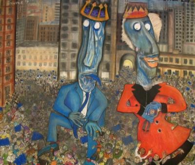 A strange, bleak, and clichéd collection of acrylic paint applied to canvas and timber.